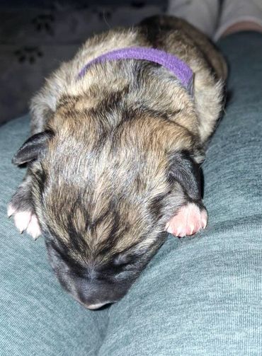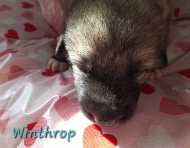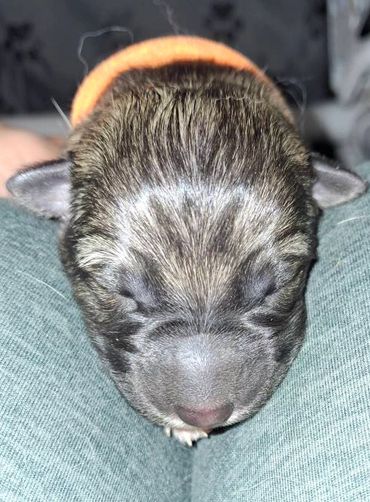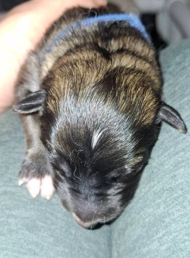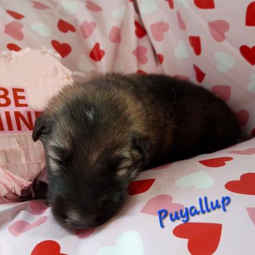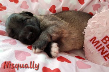 Puyallup, first up and trying to eat my finger for the treato. Puyallup is throwing us for a loop- he looked to be another miniature Henri, until he went outside... might he be another plush grey sable??!! He has an adventurous yet sweet disposition. First one through the tunnel in the play yard, and I think he managed to carry a big stick through the tunnel, even though it was wider than the opening- he problem solved that stick through the tunnel. He's one of our medium puppies, weighing in ar
